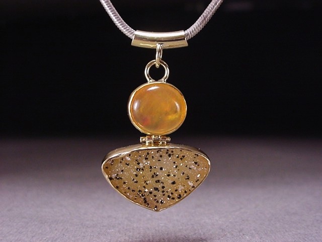 Beautiful fiery Mexican opal shows strong green and red fire and is 4.4 cts. The bottom stone is a peppery quartz druzy. 18k gold and 22k gold settings. Comes on a 20" sterling snake chain. Ask for availability and price on a similar chains in 14 or 18k gold.