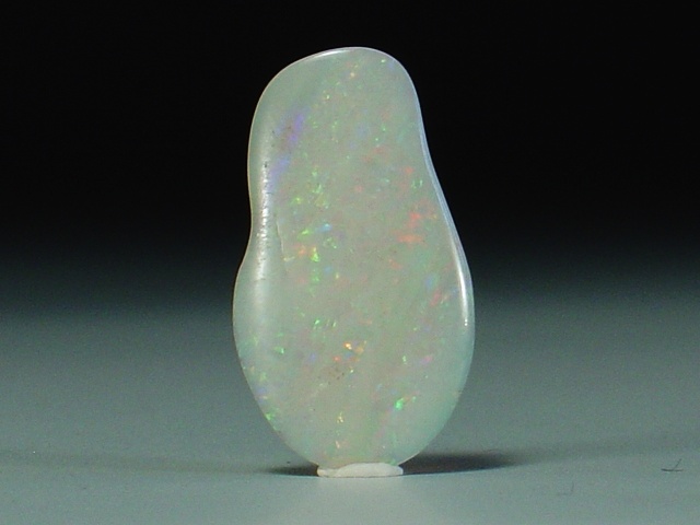 Bright fiery solid opal with red, green and blue throughout on a white base color. It also has two extra fiery stripes that run at a diagonal, one is red and one is blue and green. This is a large thin stone. I acquired it from an old WWII era collection. It was cut in the 1940's in Australia.