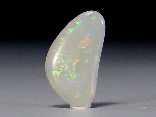 Super bright fiery solid opal with a gray/white base color. The fire is green, orange and yellow, with purple undertones. Beautiful flashes of color from all angles in this thick freeform stone. I acquired this stone from an old WWII era collection. It was cut in the 1940's in Australia and looks as beautiful today.