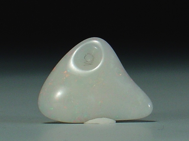 The pinfire in this solid opal is mostly orange and green. This strange freeform shape makes me think of a holloween ghost. There is a divet in the top that would probably look good drilled. I acquired this stone from an old WWII era collection. It was cut in the 1940's in Australia.