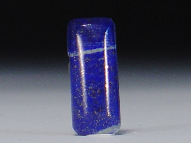 Natural bright royal blue lapis lazuli with lots of pyrite flecks and a white calcite line.